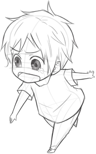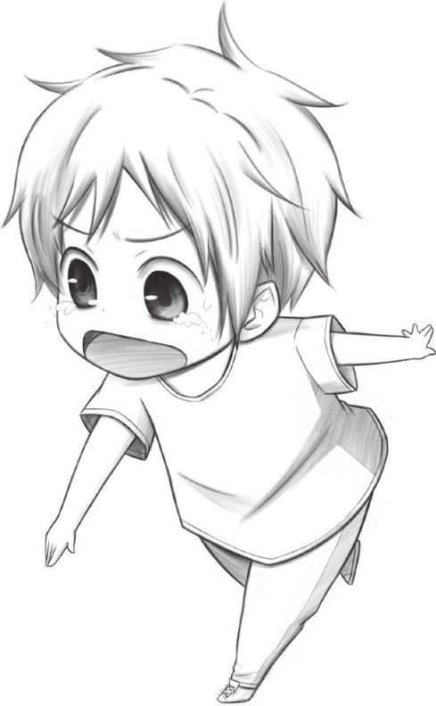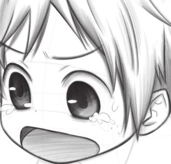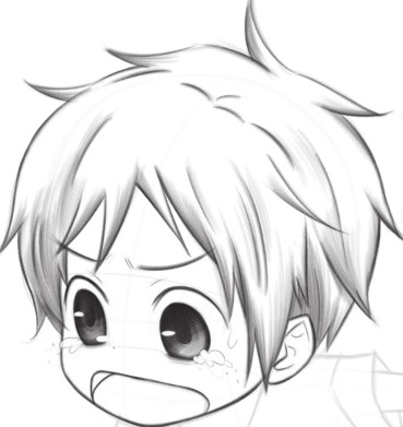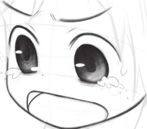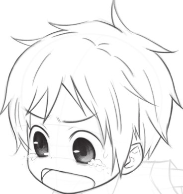 眼泪的线条要细,才能表现出水汪汪的感觉;Q版人物的鼻子小巧可爱,用小点表现即可。