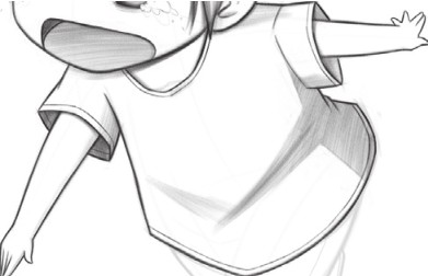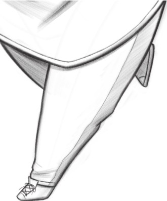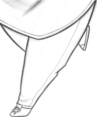 因为透视关系,人物的右腿被左腿挡住,几乎看不到;腿部和脚都简单表现,特别是鞋子,绘制出大概的样式即可。