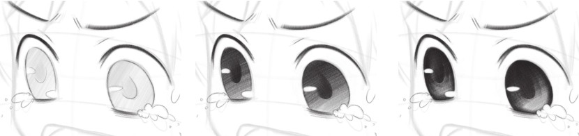 通过拷贝法整理画面;首先从眼睛开始绘制,因为近大远小的透视关系,右眼比左眼看起来要小且扁;注意瞳孔的颜色不是死黑的,而是有虚实变化的。