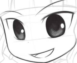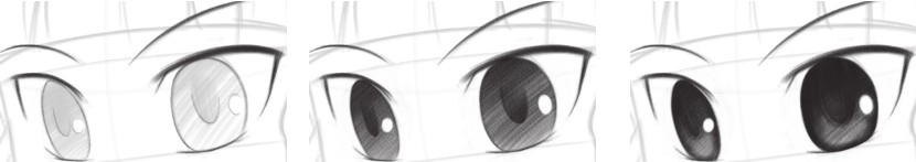 通过拷贝法,在新的纸张上描绘出需要的画稿;首先绘制眼睛,因为透视关系,右眼比左眼小且窄;瞳孔的颜色是有虚实变化的,并且有高光和反光的效果,不能绘制成死黑的。