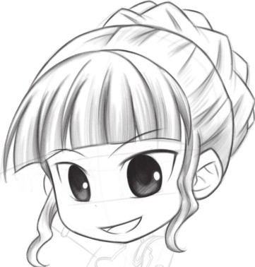 绘制头发,刘海是齐刘海,后面的头发盘起,注意头发盘起的表现要正确;绘制的线条要有轻重缓急的变化。