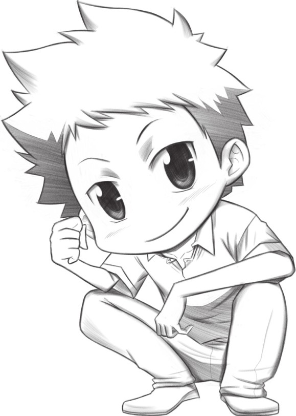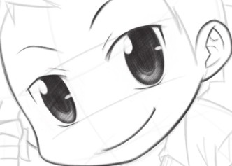 Q版人物要求可爱,所以鼻子可以不画;嘴巴简单表现即可,人物的脸型要圆圆的;耳朵的结构要把握准确。