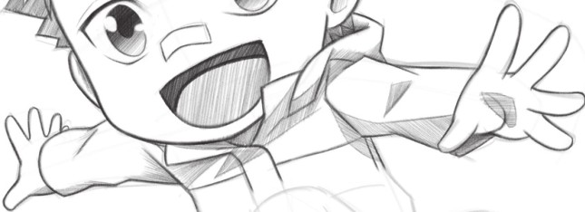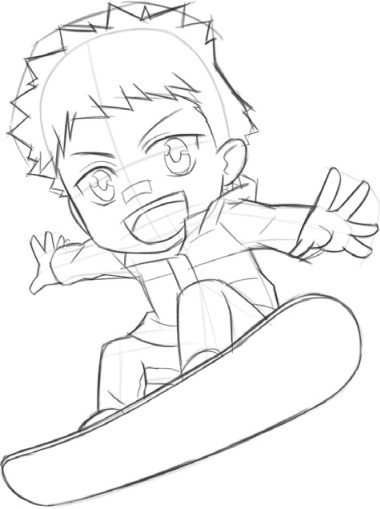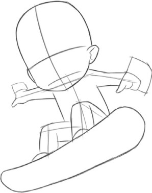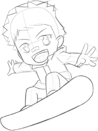 首先简单勾勒出人物滑滑板的动作,注意动作要协调,人体的透视变化要正确。