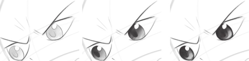 通过拷贝法,在新的纸张上描绘出需要的画稿。首先绘制眼睛,注意眼睛的结构要正确。瞳孔的颜色不是死黑的,而是有虚实变化,靠近光源的颜色深,背光面颜色浅,瞳孔要有高光和反光的效果。