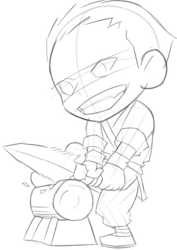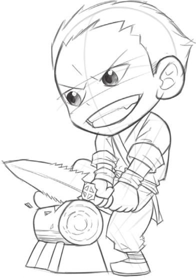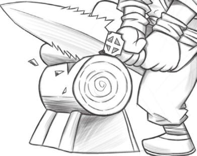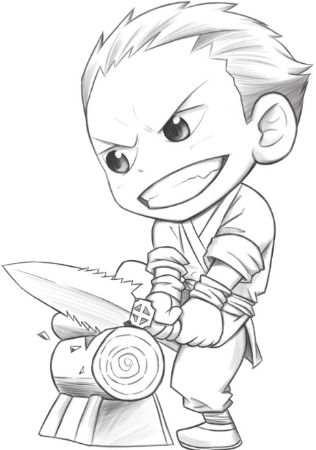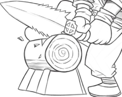 在上一步骤的基础上,大致绘制出人物发型的样式、表情的样式、服装的样式、锯的形状及木桩等。