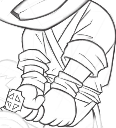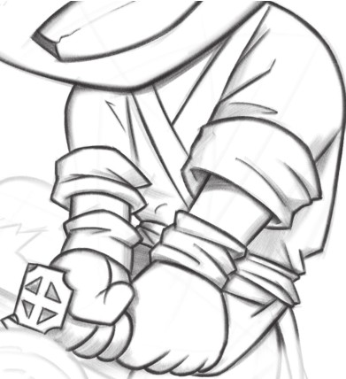 因为透视关系,右肩比左肩看起来小;衣袖挽起的表现要正确,腰带不是简单的样式,而是有褶皱变化的;注意双手握住锯把的动作要把握准确。