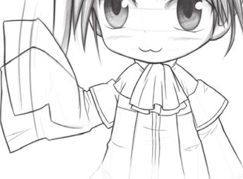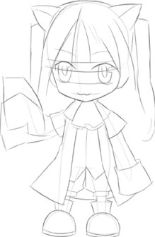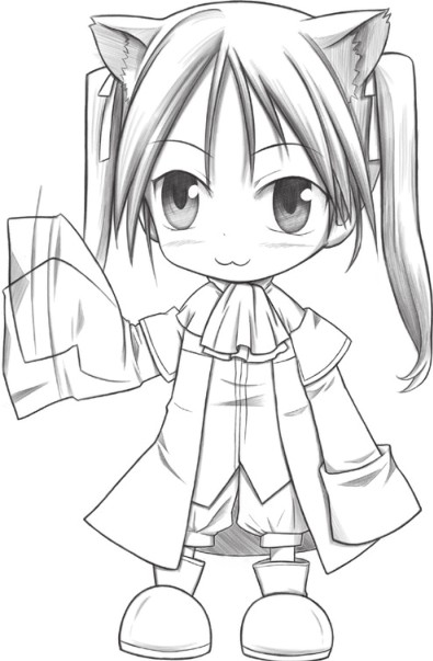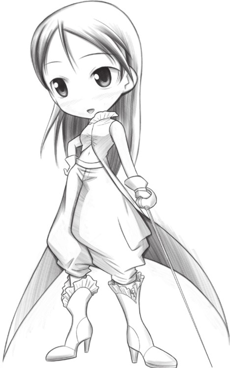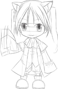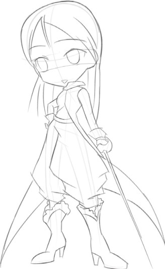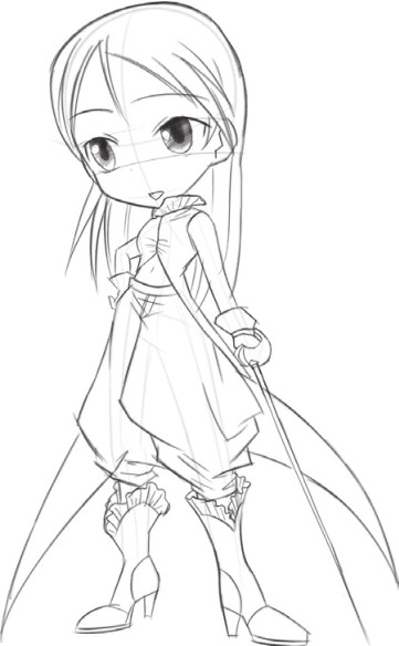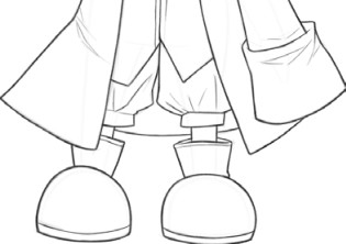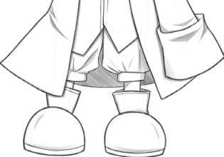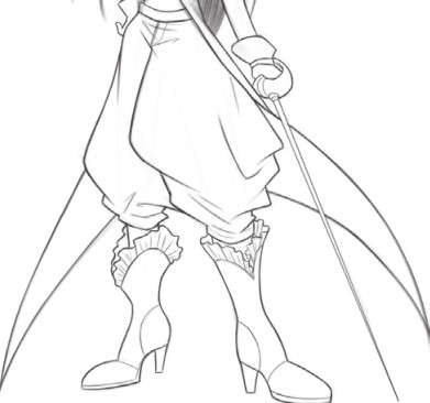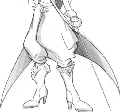 衣服很长,腿部被盖住一部分;裤腿的集束褶皱要表现正确,靴子的头部大大圆圆的,看起来很可爱;绘制的线条要有粗细的变化。
