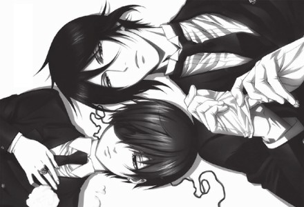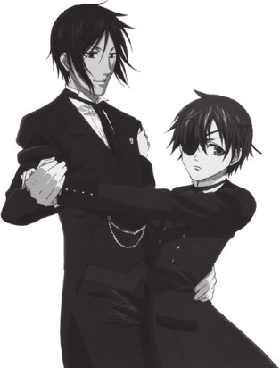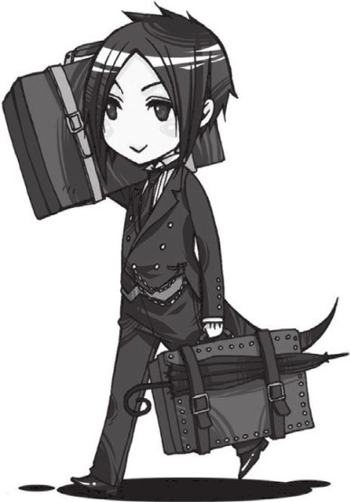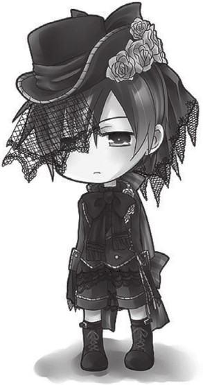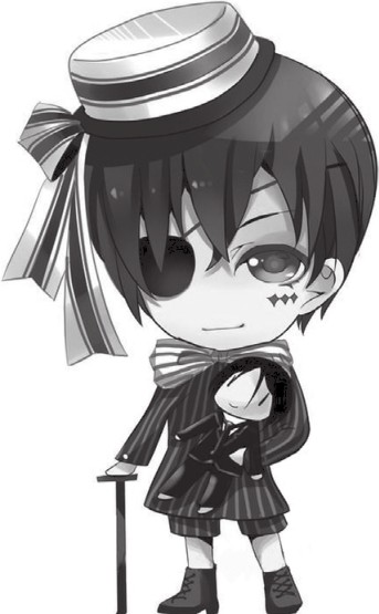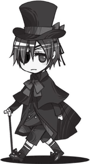 Q版角色通过夸张的表现,让人物看起来很可爱,如头大身小,眼睛大大圆圆的,占面部大部分面积,而鼻子很小,可以用小点表现,也可以不画。下面通过《黑执事》中正常的漫画人物和Q版的人物做对比,让我们更加清楚地认识到Q版人物的特点。