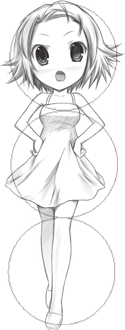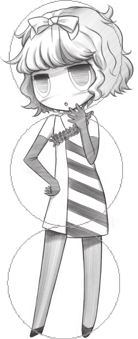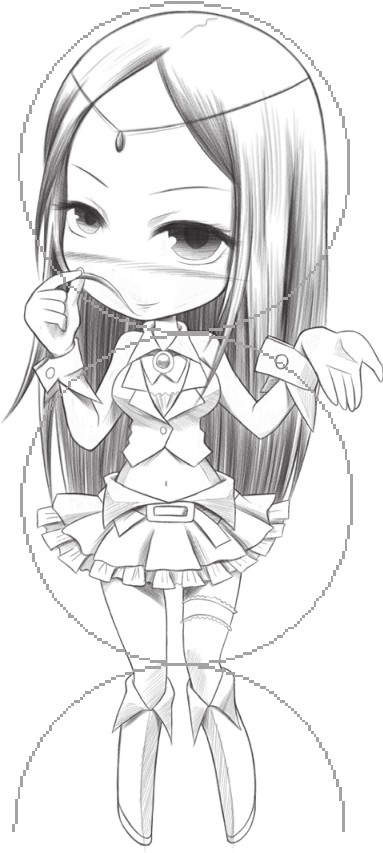 Q版角色的头身比通常为1:2~1:4,人物的头部看起来很大,而且很圆,眼睛也会很大很圆,鼻子用小点表现或者可以不用画,而身体则显得短小,且人物的结构不需要仔细刻画,简单表现即可。头身比越大的,身体的结构越简单,如2头身人物的手脚可以直接绘制成圆形或三角形。