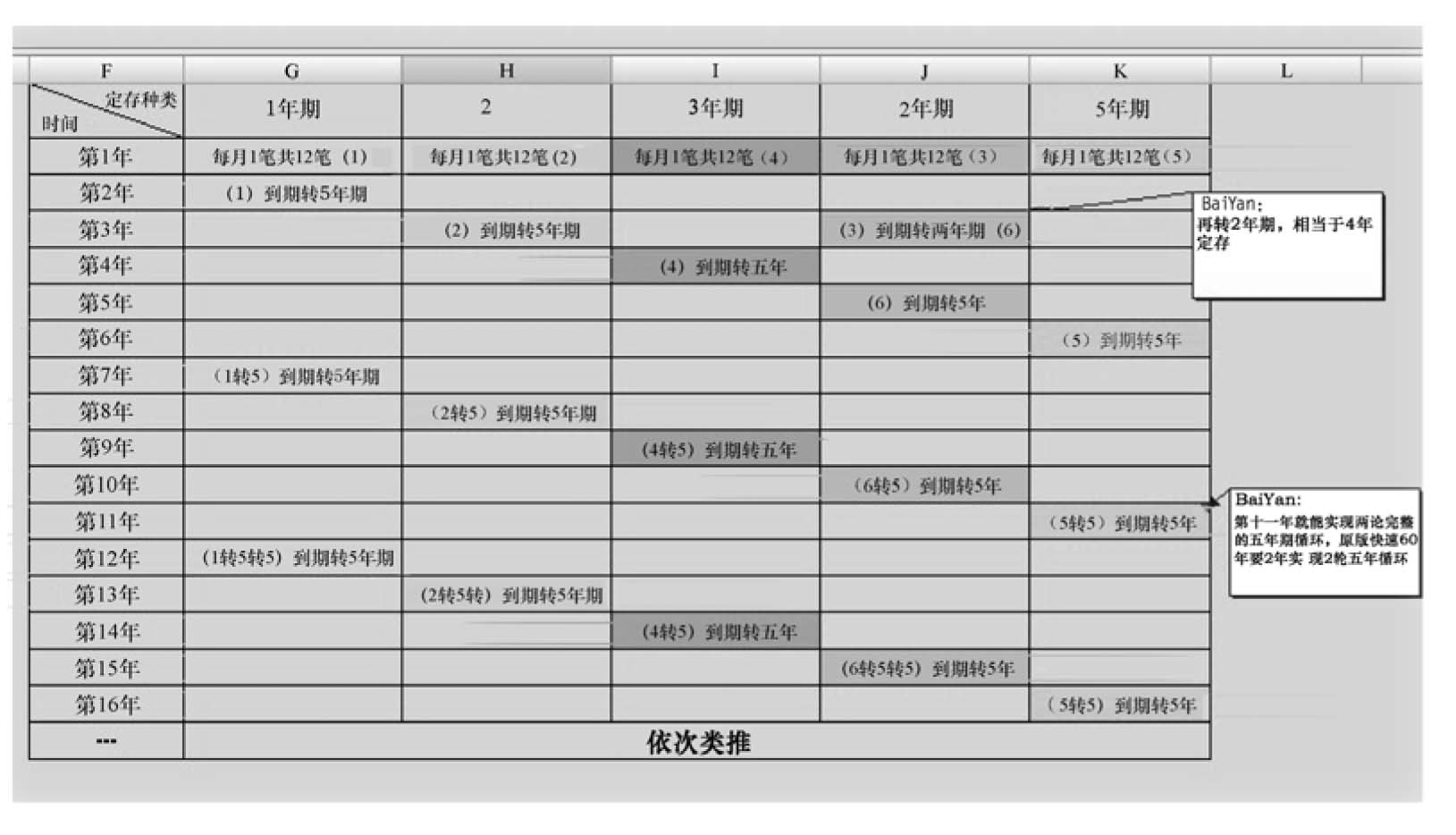 虽然这种存款方式每月储蓄的支出较大,但滚动起来更快.3年时间就可以每月都有到期的存款,保证了资金的流动性,当存款进入循环期,每一笔钱的利率都是5年期定期利率,实现了利益最大化。