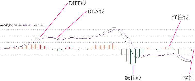 MACD(Moving Average Convergence and Divergence),即“指数平滑异同移动平均线”,利用两条长短期的移动平均线,计算其二者之差离值,用来研判价格走势,如图1-16所示。