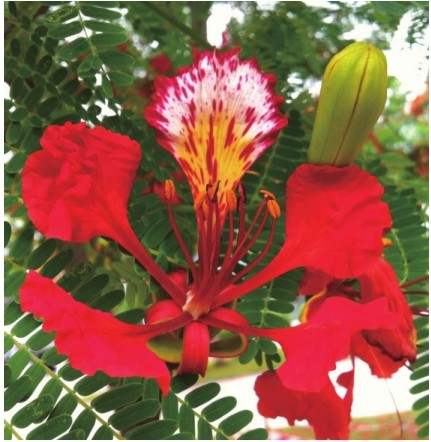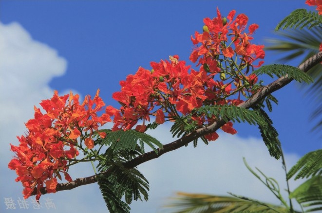 凤凰花一般指凤凰木,取名于“叶如飞凰之羽,花若丹凤之冠”,别名金凤花、红花楹树、火树等。有时我们可以从诗句中寻找创作灵感。