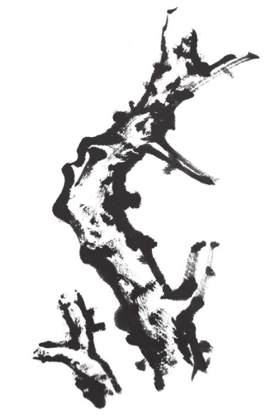 用纯水墨作画,通过墨色的浓淡和用笔的干湿变化表现意象。