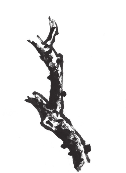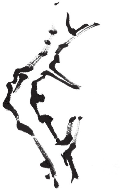侧锋运笔需将笔倾斜,使笔锋偏于墨线的一侧,笔锋与纸面形成一定的角度。侧锋运笔用力不均匀,时快时慢,时轻时重,其效果毛、涩变化丰富。由于侧锋运笔是使用毛笔笔锋的侧部,故可以画出粗壮的笔触。此法多用于山石的皴擦。