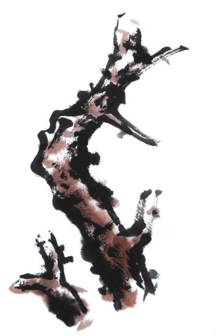 泼墨法是一种有意地将不均匀墨和水挥泼于宣纸上的作画方法。这种挥泼而成的笔痕、水痕有一种自然感与力量感,但有很大的偶然性与随意性,是作者有意与无意的产物,容易出现既在情理之中又在意料之外的效果。
