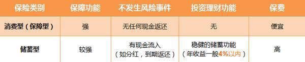 3. 消费型保险除非发生赔付的事件,否则没有任何现金返还;储蓄型保险除了发生赔付事件会进行赔付外,还会有分红、到期返还等收入。