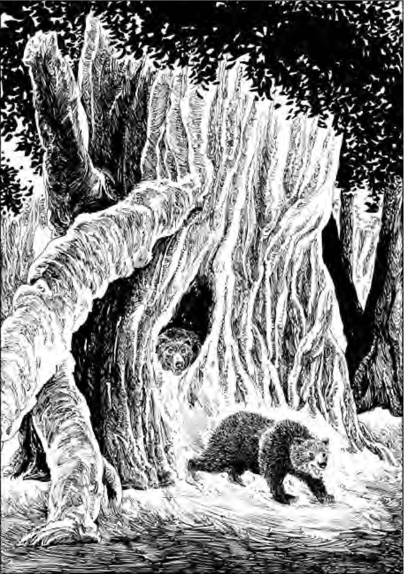 “这头恶熊,把这条有一节节黑色圈环的虎尾当做旗帜挂在榕树洞上,吓唬飞禽走兽。那些野兔、鼷鹿、九节狸远远见到它,立刻惊慌逃窜;就是蟒蛇、野猪这样的猛兽,见了它也赶紧让路呢;甚至连小鸟都不敢在它居住的大榕树上垒窝搭巢。哼!”巴康艾诺气愤地说道。
