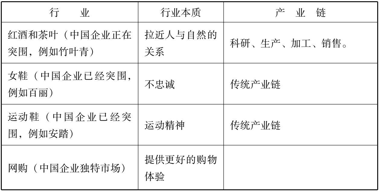 我特别挑了几个消费品行业,这些行业必须同时把握行业本质和产业链的整合才能够突围。请读者注意,具备行业本质的企业一定是面对消费者的企业。我将中国面对消费者的企业突围现状分成这样几个类型讨论。