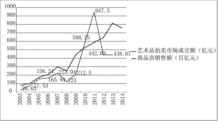 图3-2 2003 —2014年艺术品市场成交额与房地产市场销售额对比