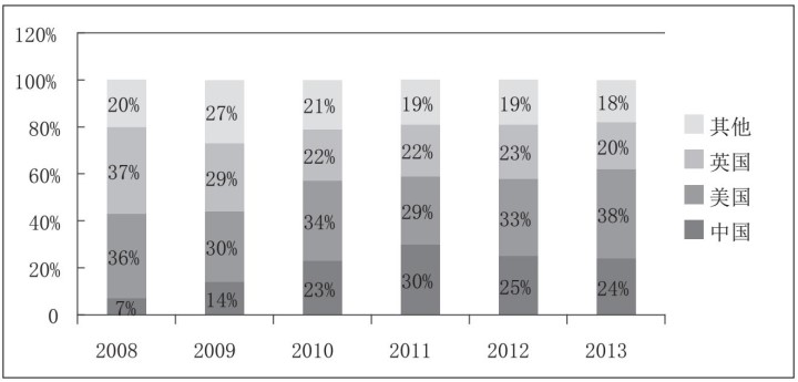 再来看图3-3,中国艺术品市场在世界艺术品市场中所占份额。2008年之前中国的艺术品市场只占全世界的7%,但是到了2011年,竟然占到了30%,取代美国成为全世界艺术品交易最大的国家。因此2011年的泡沫最大,销售金额达947亿元。2012年,中国的份额又跌回到了25%,2013年跌回到了24%,销售金额跌到了442亿元。