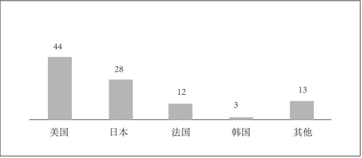 今天我提出一个全新的思维,叫作文化产业战略“三步曲”。第一步,重视创造力。电影电视归根到底是创造力的竞争,我想这一点没有人否认。谁的创造力最强呢?请大家看图1-2,2013年路透社评选出全世界最有创造力的100家企业。美国有44家,日本28家,法国12家,韩国3家。韩国虽然只有3家,但请你记住,韩国只有美国一个州那么大。