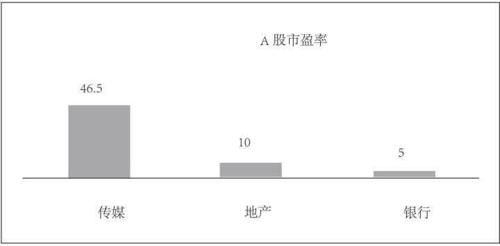 我们研究发现,国产电影不但发展势头强劲,其融资方式也呈现一种新趋势。首先,从股市表现来看,2013年,传媒板块有54家上市公司,股票平均回报率为103%,是2013年回报率最高的行业板块之一。再看图2-4,根据WIND资讯的数据显示,目前A股市场上传媒行业共有54家上市公司,行业整体市盈率46.5倍,而与此相对应的是,地产股行业整体市盈率仅有10倍左右,16家银行市盈率全部在5倍以下。这么高的市盈率,无疑会使大量资金流向电影行业,这将产生什么样的结果,我们拭目以待。