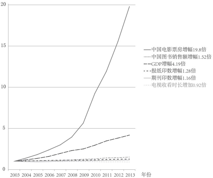 来看图2-1,从2003年到2013年的11年间,中国的GDP涨了4.2倍,那么各个出版传媒产业的增长率呢?最好的是电影,11年来增长了19.8倍,远远超过GDP增幅;而图书销售额11年只增长了1.52倍,远远低于GDP的增长;而报纸的增幅还不如图书,只有1.28倍;期刊呢,更差了,1.16倍。各位猜最差的是什么?是电视。电视是所有传媒行业唯一下跌的,是0.92倍,换句话讲,与11年前相比,大家看电视的时间下降了8%。因此,电影可以说是目前增长势头最猛的传媒产业了。除了电影之外,像图书啦、报纸啦、电视啦,都处于非常艰难的局面,而且我相信在未来两三年会更加艰难,我想这才是郭敬明和韩寒转战影坛的真正原因。