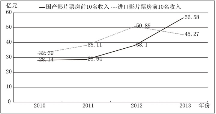 图2-2 2010—2013年国产和进口电影票房前10名收入