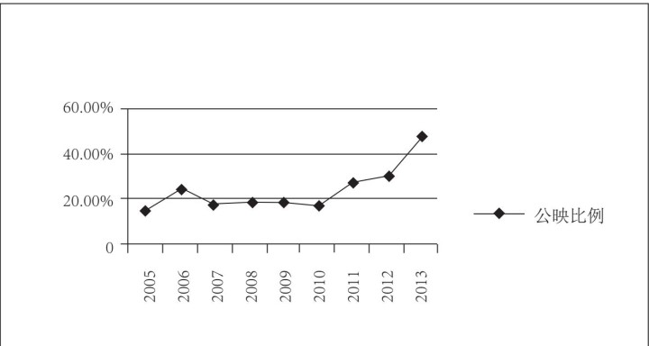 电影行业火爆了,那大家可能担心,会不会出现国产电影一拥而上、粗制滥造的情况呢?请看图2-3。我们发现,过去电影的公映率只有20%,也就是说,拍100部片子,只有20部片子有机会公映,其他80%的片子都浪费了。可是2013年公映的比例竟然达到历史的新高——接近50%,换句话讲,开拍的片子变少了,公映的比例增加了。以数据说话,2012年国产片是745部,2013年减少了107部,是638部,因此公映比例大幅上涨。这是可喜的现象,代表国产电影告别粗制滥造,开始重视打造精品。