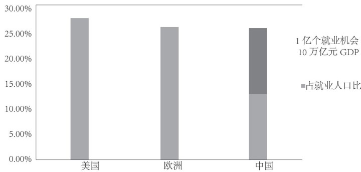 请看图2-5。对于目前的中国知识产权集约型行业规模,我们找不到所谓权威的数据,估计应该是不到欧美的一半。如果我们能够加大知识产权保护力度,让行业规模增长一倍,达到欧美的水平,那么这个行业的就业人口就可以增加1亿,而且它的主要就业人口为大学毕业生;GDP可以增长25%,约10万亿元人民币。通过知识产权保护,让创意产业在解决大学生就业的同时,成为中国经济增长的新引擎,这将是一个不得了的成绩。