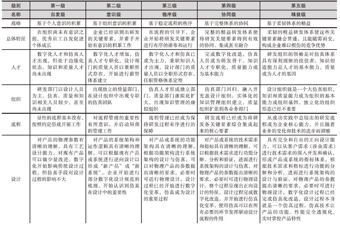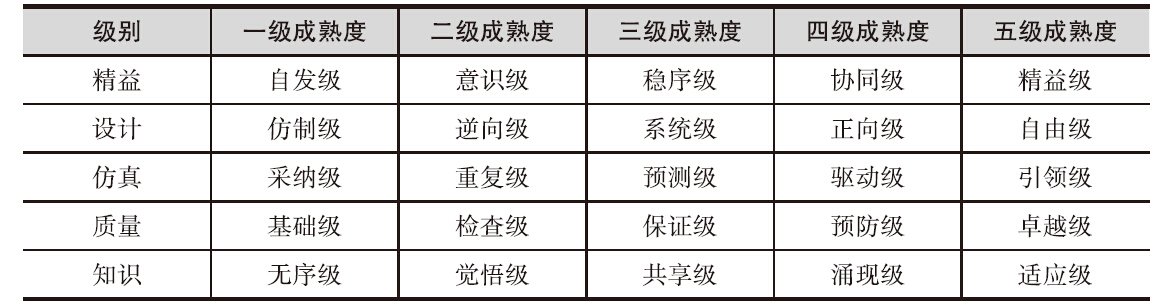 精益研发成熟度分为五级,分别是自发级、意识级、稳序级、协同级、精益级(见图3-2)。对精益研发包含的四个重要子体系(综合设计体系、综合仿真体系、知识工程体系、过程质量体系)也进行了五级成熟度划分,这四个子体系的成熟度与精益研发整体成熟度一脉相承。各级成熟度名称、战略、总体特征如表3-1所示。