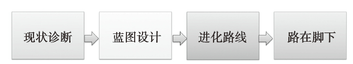 精益研发规划步骤依次为:现状诊断、蓝图设计、进化路线和路在脚下,如图3-1所示。