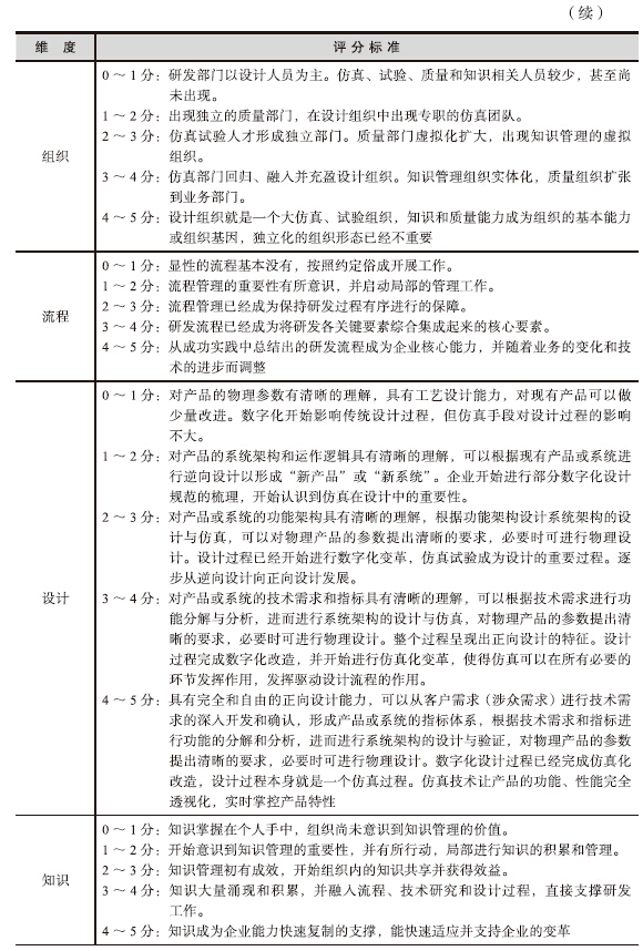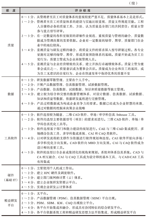 企业精益研发成熟度从战略、人才、组织、流程、设计、知识、质量、数据、工具软件、硬件、精益研发平台等方面进行评估。每个维度的评分范围为0~5分,精确到小数点后1位。各个维度的评分标准如表3-3所示。