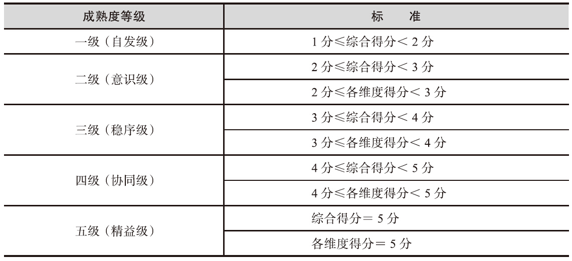 企业精益研发体系的成熟度评级根据各维度得分和综合得分进行,评级标准如表3-5所示。