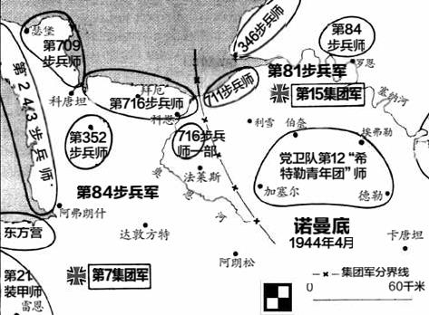 而负责守备诺曼底地区的主力部队第7集团军则迟至凌晨4:00才发出战备命令。整个夜间,诺曼底登陆区域里德国空军的雷达没有一个是正常的,夜间战斗机被派往加莱的艾敏斯的上空以对付一个子虚乌有的轰炸机群。由于无法判断这次空降突击的规模与盟军进攻的态势,B 集团军司令部甚至认为没有必要立即通知已返国述职的总司令隆美尔,事实上,隆美尔本人直到登陆日早上的7:30才被告知诺曼底的情势。在这么关键的时候,B集团军群的指挥链条依然昏昏欲睡,然后师长、军长、集团军司令又接二连三地丢命或负伤,整个军部陷入混乱之中了。