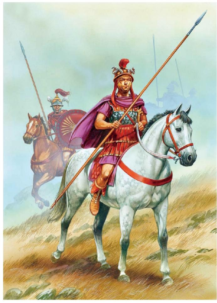 ◎ 公元前2世纪的马其顿骑兵形象。中部配有横向加强筋的大型圆盾,成为希腊化时代晚期的希腊半岛尤其是马其顿骑兵喜爱的装备。