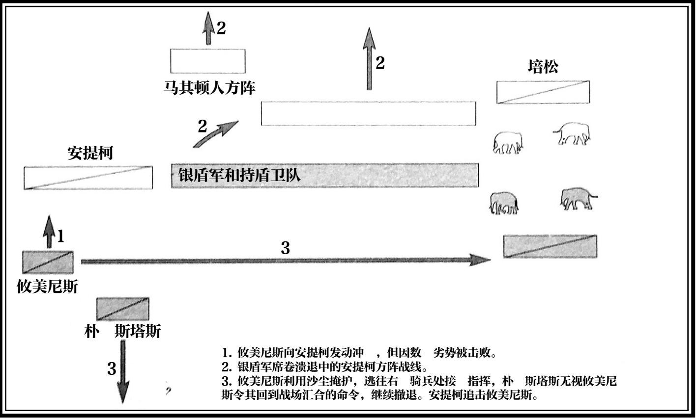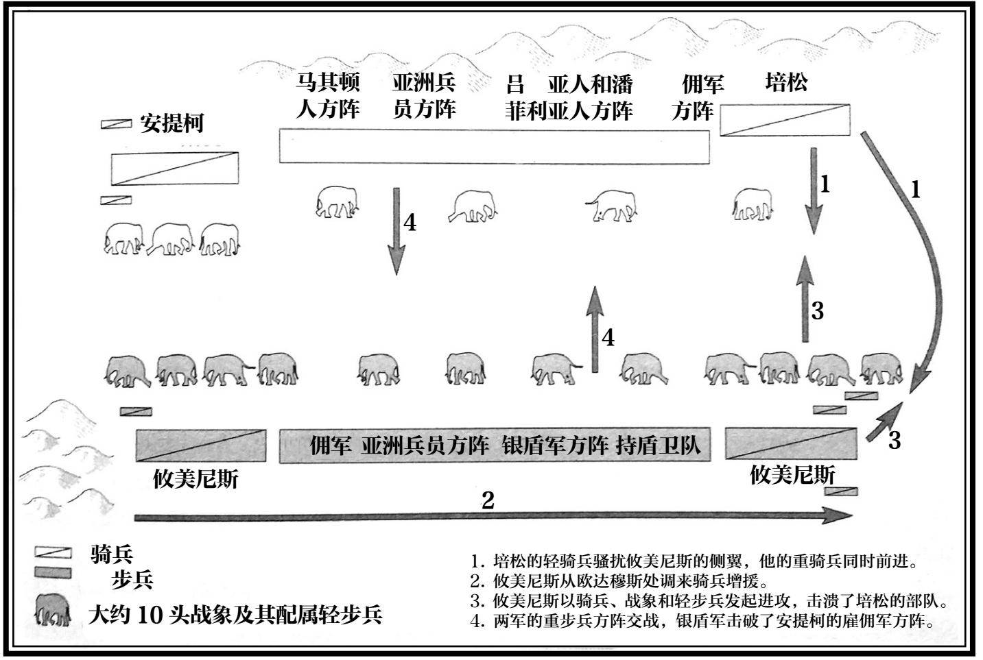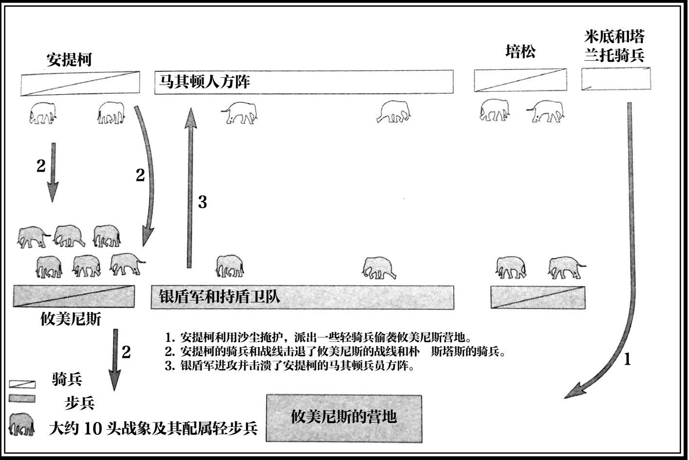 ◎ 安提柯的决定性打击。凭借准确的判断,安提柯最后的骑兵突击挽回了败局。