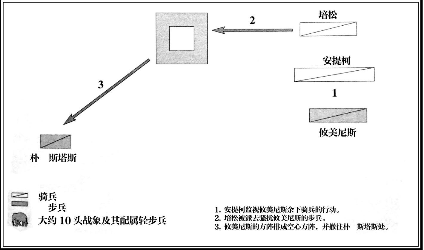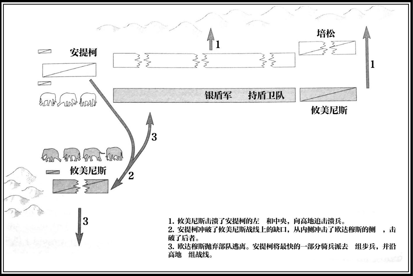 在战场的另一边,攸美尼斯则亲自指挥约2900名重骑兵和40头战象,其中也包括了数百名伙伴骑兵的老兵。和安提柯一样,攸美尼斯同样以数百人编组成小的战术单位,作为主力的前卫和侧翼保护。他面对的是安提柯的副手米底总督培松,后者拥有4900名轻骑兵,包括了部分来自帕提亚的马弓手和塔兰托的标枪骑兵,而这些骑射手的灵活性将对敌人造成严重的威胁。