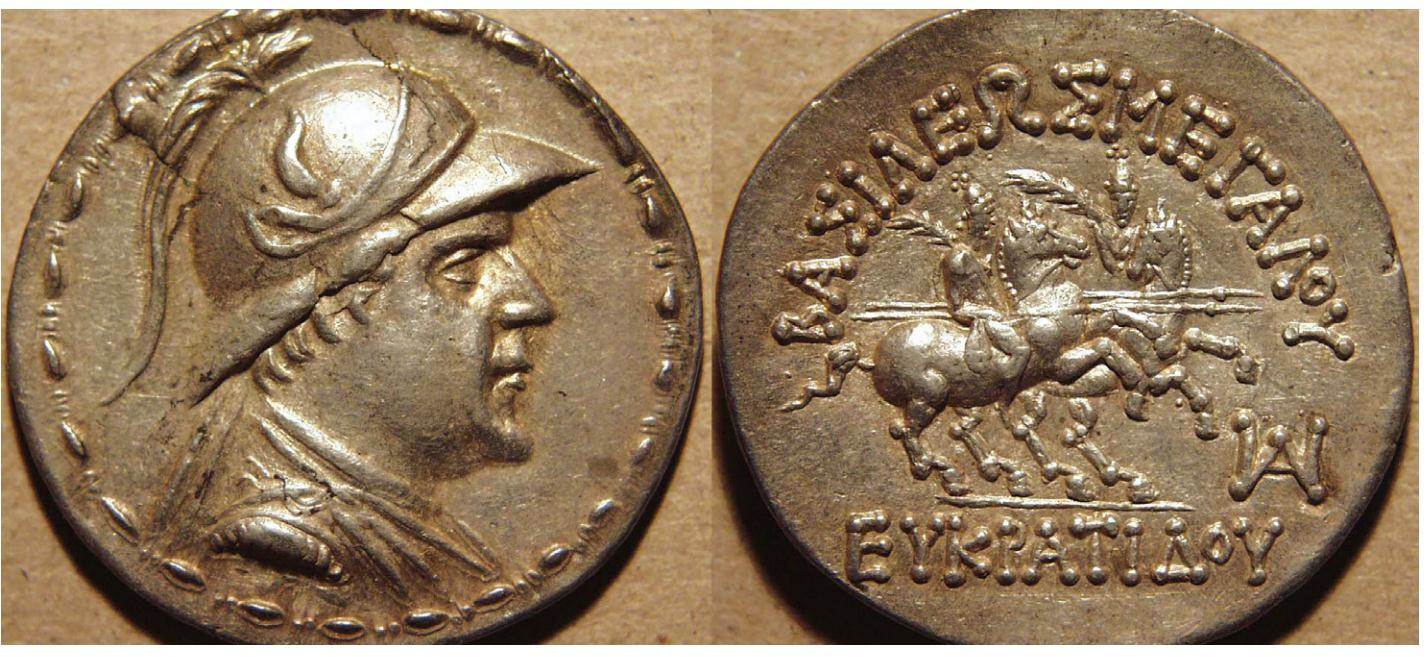 在东方的巴克特里亚,希腊移民和伊朗贵族组成的伙伴骑兵部队,或许比塞硫西帝国的骑兵,更早地完成了重型化、具装化的改革。受到更多来自游牧民族的影响,东方的希腊伙伴骑兵,在其重型化的进程中,更多地采用了扎甲。竖立在马臀部的“寄生”,也出现在巴克特里亚和印度-希腊王国的铸币上,成为伙伴骑兵东方化的一个象征。