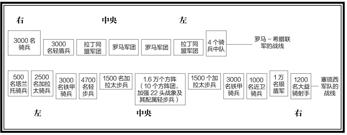 这一部署方式,不免让人想起后世凯撒与庞培的法萨卢斯会战,同样在总兵力和骑兵数量上占尽劣势的凯撒,采取了几乎一模一样的布阵,略去了“左翼”,而将主要的胜算放在其步兵上。我们也可以猜测,西庇阿在此时的想法与后来的凯撒不谋而合,他将借助弗里吉乌斯河掩护自己的左翼,以全部骑兵和轻盾兵防守右翼,对手在这里的迂回将会需要更长的路程,从而给罗马步兵更多的发挥时间。