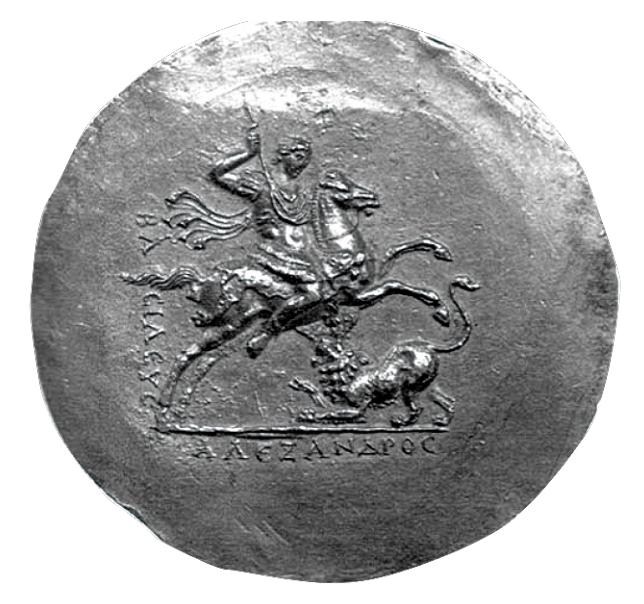 ◎ 图为罗马金币上的亚历山大形象。图中出猎的亚历山大选用了较短的长枪,并反手握持。正手夹持、正手握持或是反手握持的持枪方式,均出现在了伙伴骑兵的相关艺术形象上。