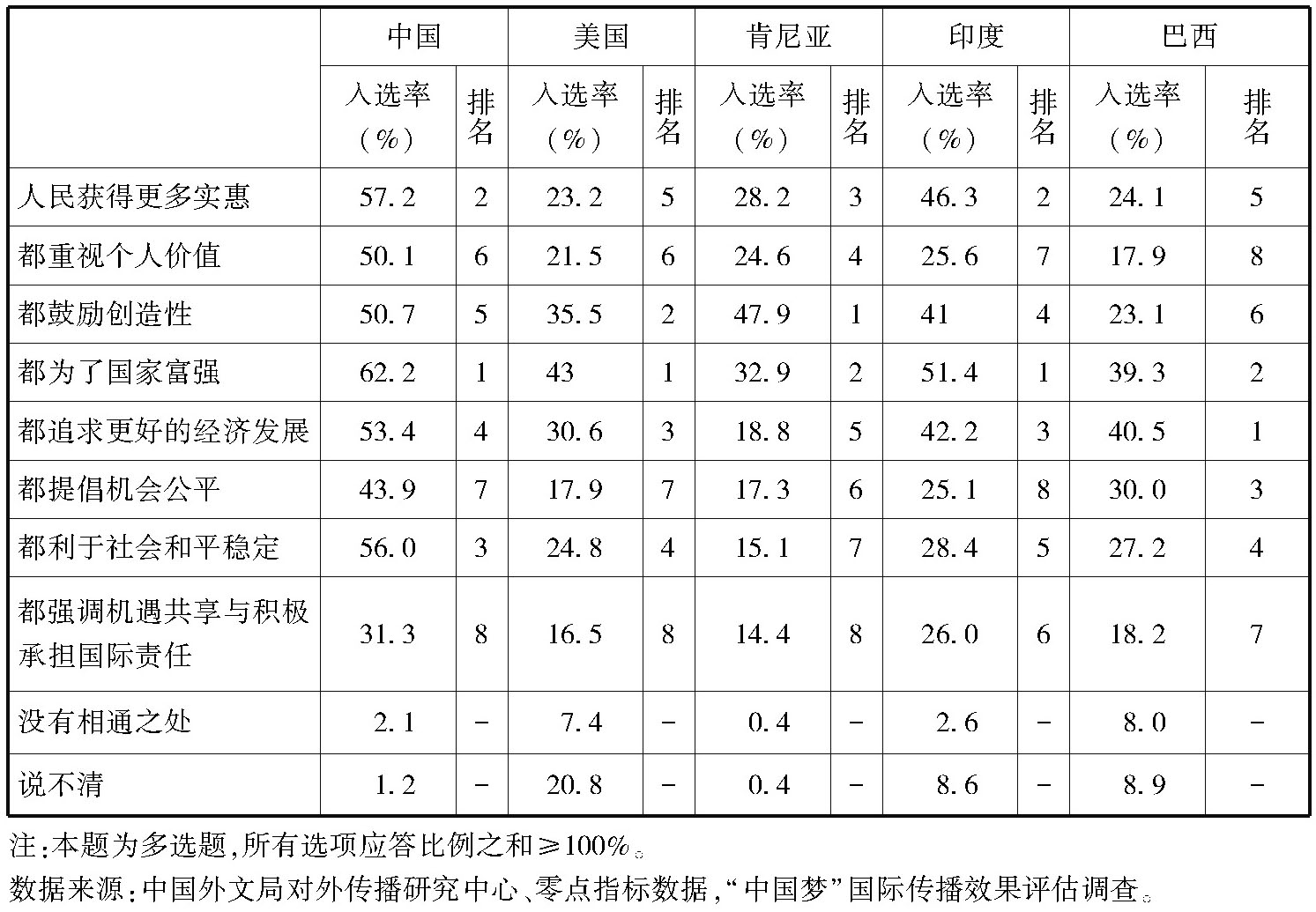 项目组试图通过半开放式多选题,获知受访者对“中国梦”理念基础的认识。在调查列举出的12个理念性词条中,“以人为本”“改革创新”和“自强进取”是整体入选率相对最高的三项。其中,“改革创新”在美国、肯尼亚和巴西三国受访者中的入选率排名首位;“以人为本”则在中、印两国居首。
