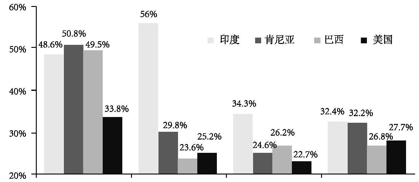 综上,肯尼亚对“中国梦”的态度最为积极:了解程度最高、信心最大、认同感最强,体现出肯尼亚对中国的关注和看重;与我国同为“金砖国家”和新兴发展中大国的巴西、印度,对“中国梦”的了解程度较低,但信心较大,认同感也较强;美国对“中国梦”的了解程度最低、信心最小、认同感最弱,体现出美国公众对中国未来发展的观望和疑虑态度。