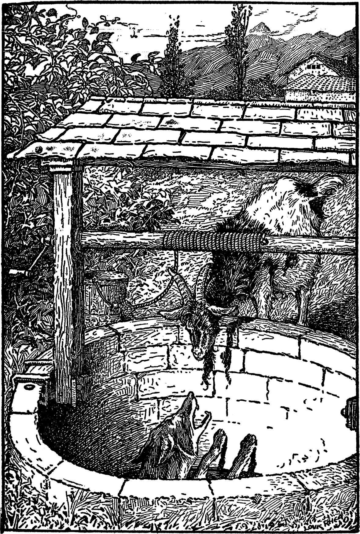 山羊很乐意地接受了狐狸的建议,狐狸便蹿上山羊的后腿,再爬上山羊的后背,然后凭借山羊的犄角找着井沿,爬了上去,准备离开。