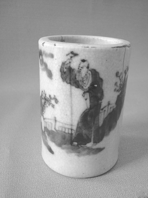 明代青花笔筒老人拄杖图