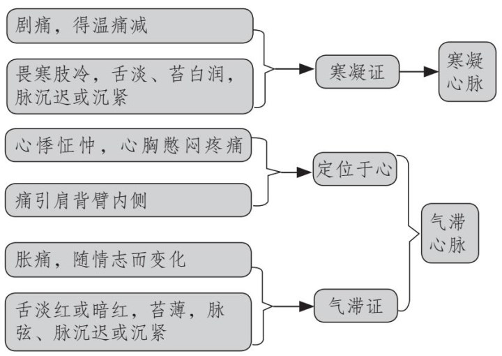 (3)突发剧痛,遇寒加重,得温痛减,伴有畏寒肢冷、舌淡苔白、脉沉迟或沉紧等寒象——寒凝心脉;