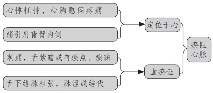 (1)以刺痛为特点,伴有舌紫暗、瘀斑与瘀点、脉细涩或结代等瘀象——瘀阻心脉;