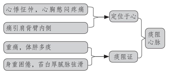 (2)以心胸闷痛为特点,伴有体胖多痰、身重困倦、苔白腻、脉沉滑等痰象——痰阻心脉;