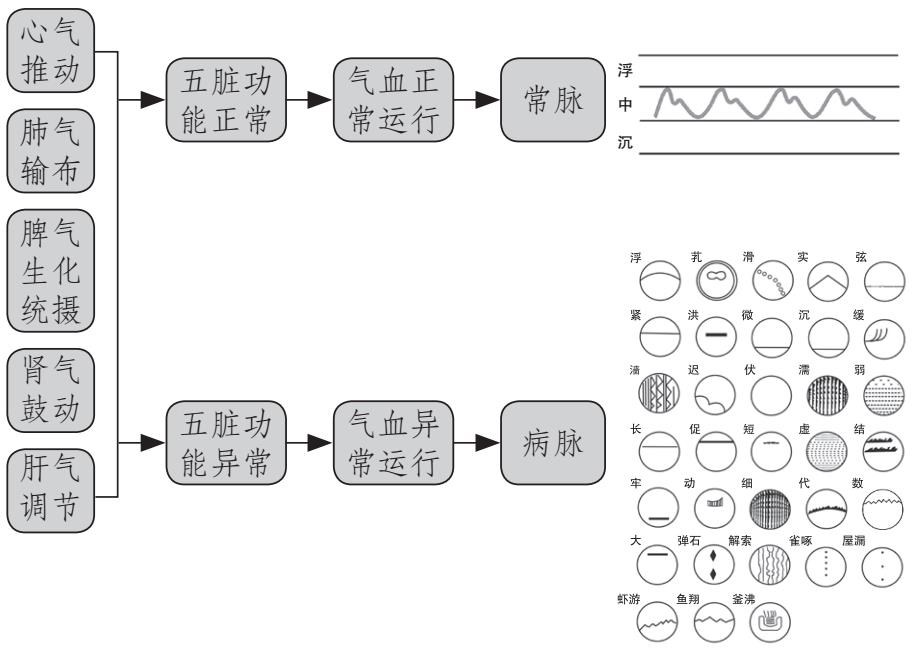 脉象是指脉动时的应指形象。祖国医学认为,心主血脉,心脏有节律的搏动推动血液在脉管中流动。心与脉相连,脉为血之府,血液循行脉管之中,流布全身,因而脉管也随之产生有节律的搏动;肺主气,朝百脉,血液通过肺气的输布布散到全身;脾主统血,脾胃为气血生化之源;肝藏血,主疏泄以调节血量;肾藏精,精化血。因此,脉象的形成与各脏腑气血密切相关。