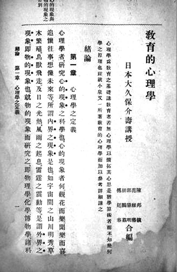 日本学者久保田贞则所著的《心理教育学》(未署名译者)于1902年由上海广智书局出版,这是由日本人所著、在中国出版的最早一本教育心理学译著。它比桑代克1903年写成的《教育心理学》还要早一年。《心理教育学》一书除“总义”外,共分十二章,章名依次如下:心意总论、心身关系论、心意发育论、注意力、感觉力、知觉力、记忆力、想象力、概念力、断定力、推理力与教授法。这表明,该书包括心理学、逻辑学与教学论三方面的基础知识,是心理学在教育上的初步尝试应用。可见,由于当时的教育心理学还谈不上什么理论体系,所以它的内容显得十分庞杂。